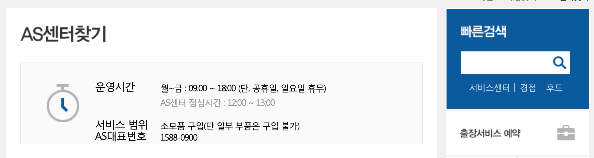 만약 직접 서비스센터를 방문하고자 하신다면 상단 오른쪽의 [매장 찾기] - [AS센터 찾기]로 들어가셔서 가까운 센터를 확인하실 수 있습니다. 서비스센터의 운영시간은 월-금 9:00 ~ 18:00 까지 운영되고 있으며 점심시간은 별도로 12:00 ~ 13:00까지이므로 이점에 유의하시기 바랍니다.